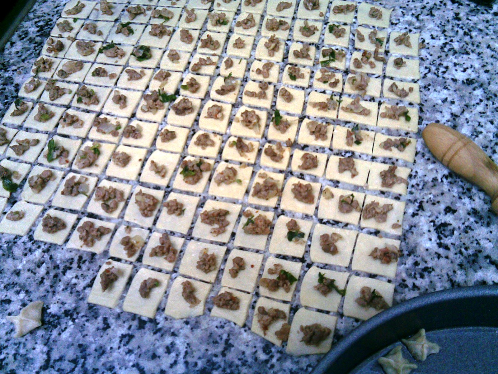 Genişçe bir kapta unun ortasını açın, 2 adet yumurta ekleyin. Bir tutam tuz serpin ve azar azar su ilave ederek katıca bir hamur yapın. Hamurun ne çok kaskatı ne de çok yumuşak olmalıdır. Hamurdan bezeler yaparak, bunları teker teker, hazır yufkadan daha kalınca olarak açın. Diğer tarafta içine az karabiber,ince kıyılmış maydanoz ve soğan karıştırılıp hafifçe yoğurulmuş kıyma hazırlayın. Kıymadan kopardığınız fındık iriliğinde parçaları ikişer parmak arayla açtığınız yufkanın üzerine koyun.