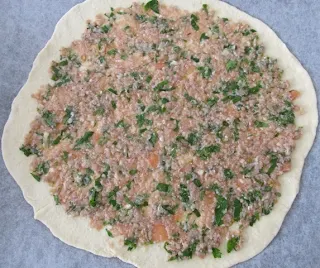 Açtığımız hamurun üzerine hazırladığımız kıymalı harçtan koyuyoruz ve heryerine eşit şekilde yayıyoruz.Bu aşamada dilerseniz kenarlardan 1 cm boşluk bırakabileceğiniz gibi hamuru tamamen harçla da kaplayabilirsiniz.
